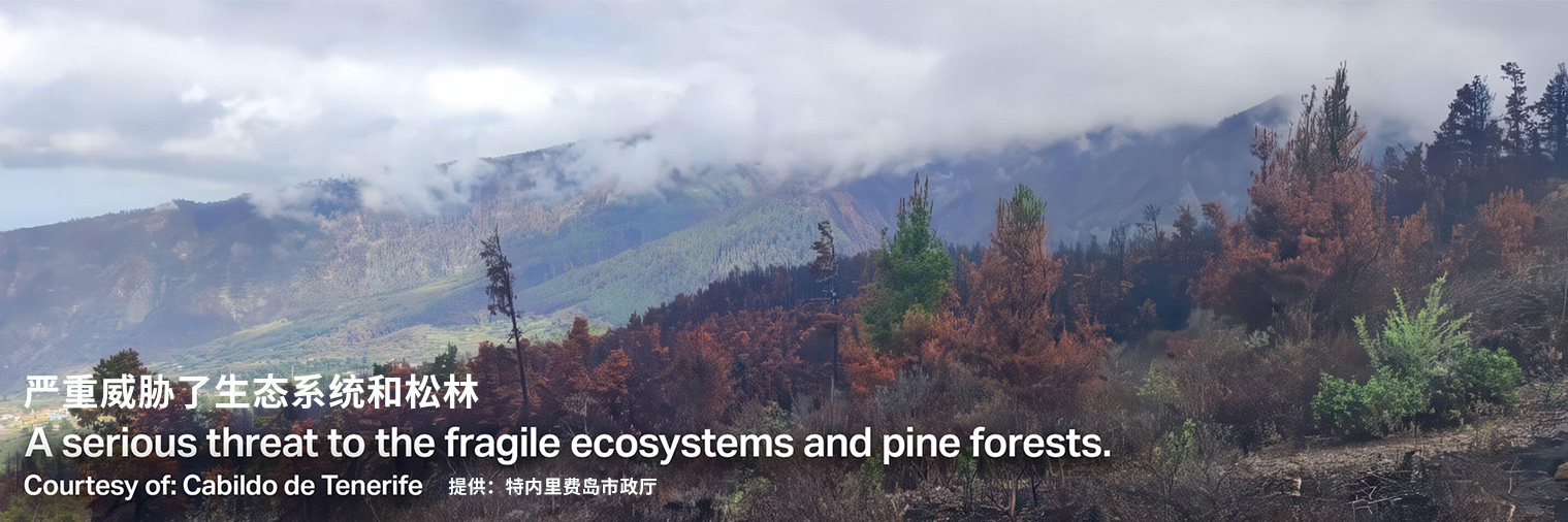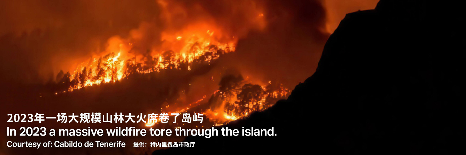 西班牙加那利群島中最大的島嶼--特內(nèi)里費(fèi)島,在這個被聯(lián)合國教科文組織列為世界遺產(chǎn)的地方,古老的綠色與火山地貌相融合,陽光穿透薄霧籠罩的山巒,延伸至連綿的松林。然而,由于炎熱的氣候和松林的組合,這種美麗的風(fēng)景很容易發(fā)生森林火災(zāi)。